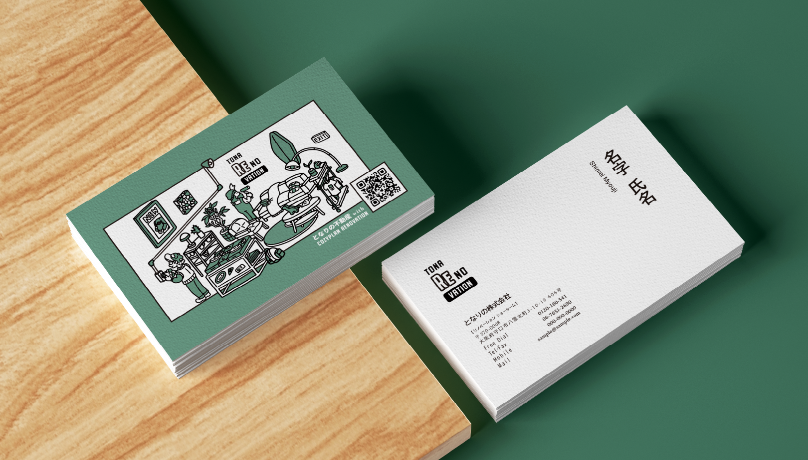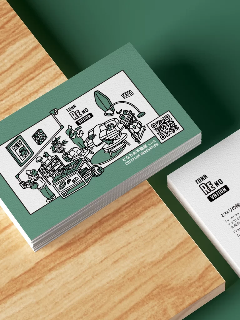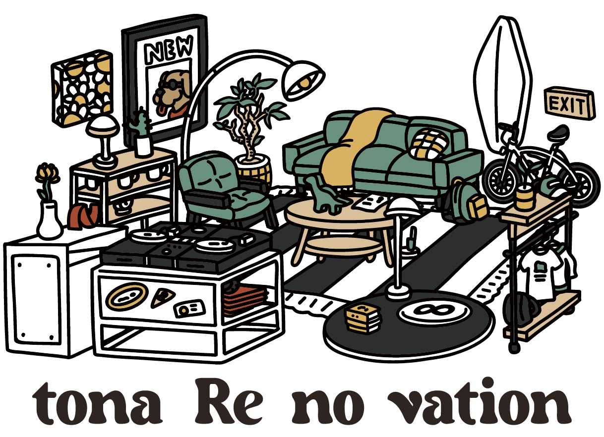 「となりの株式会社」のリノベーション事業「TONA RE NO VATION」の、ロゴ、イラスト、名刺のデザインを担当しました。大工でもあるオーナー様が、自ら現場で働く様子を発信されている、温かな雰囲気の会社です。